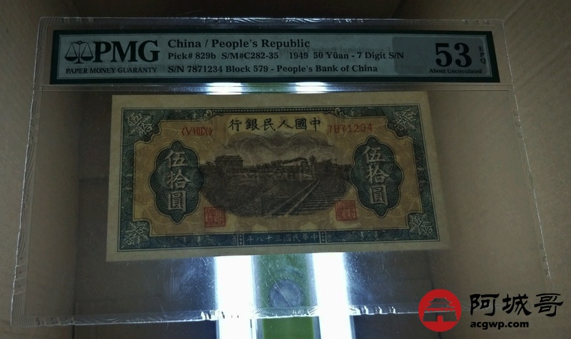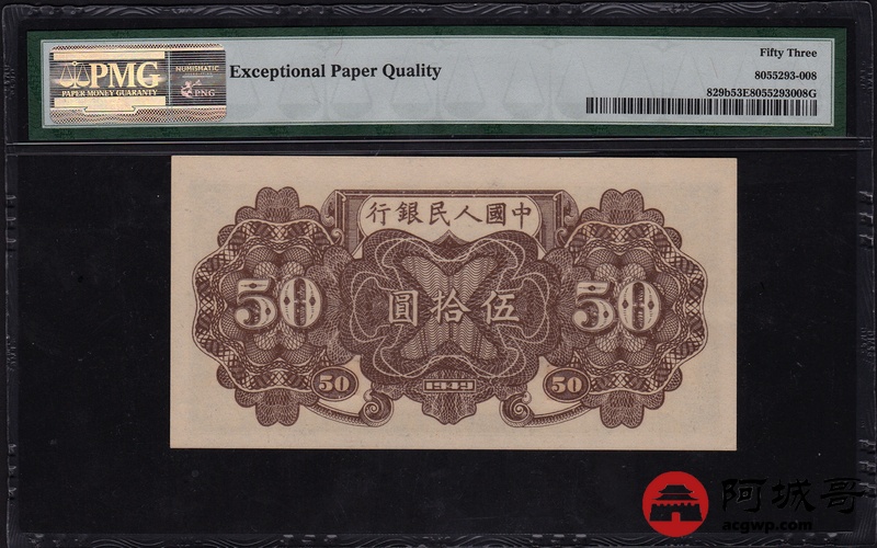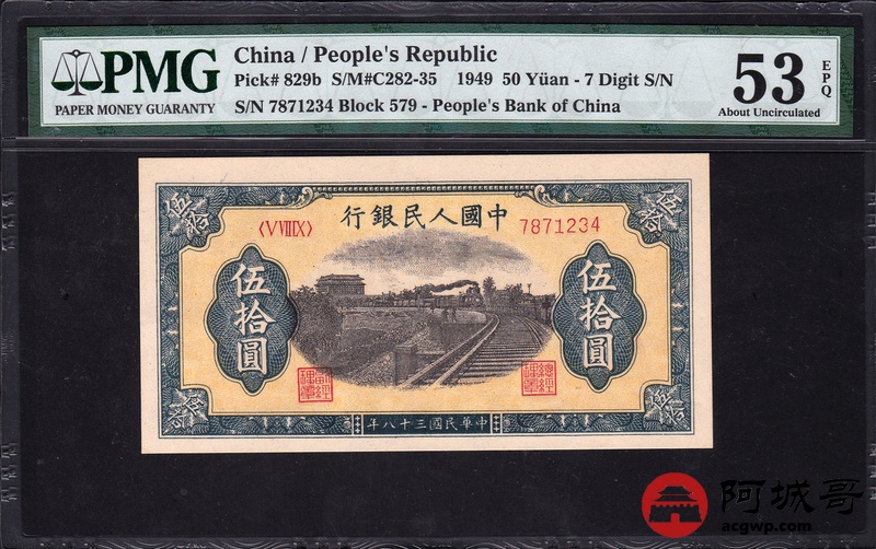 Lot:9 一版人民币 民国38年 伍拾圆铁路 中国人民银行 PMG 53 EPQ 尾趣味号1234
