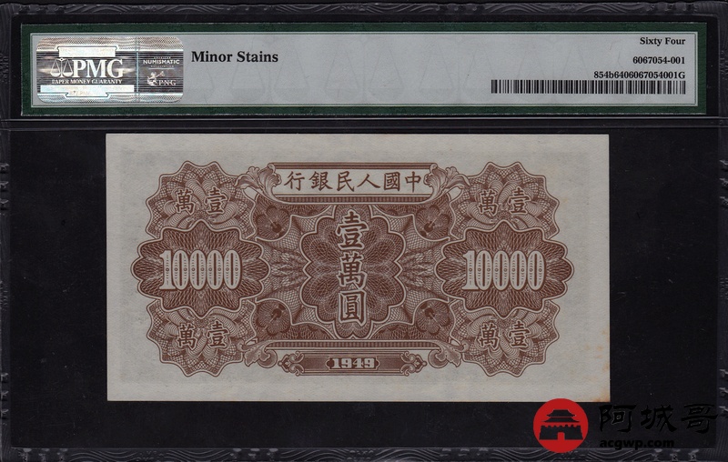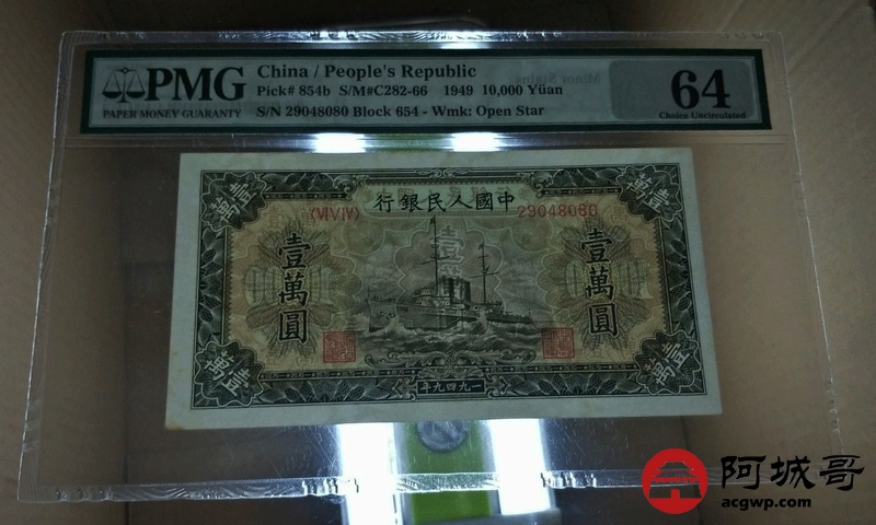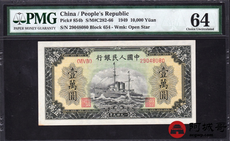 Lot:12 一版人民币 1949年 壹萬圆军舰 中国人民银行 PMG 64 空心五角水印