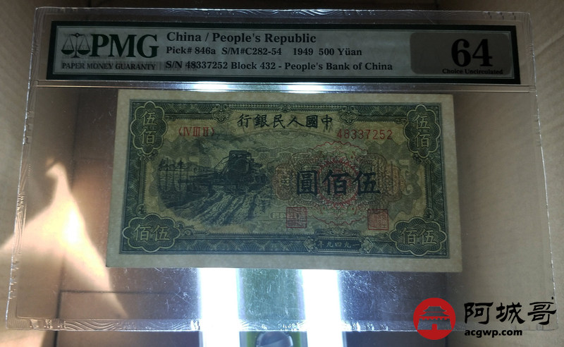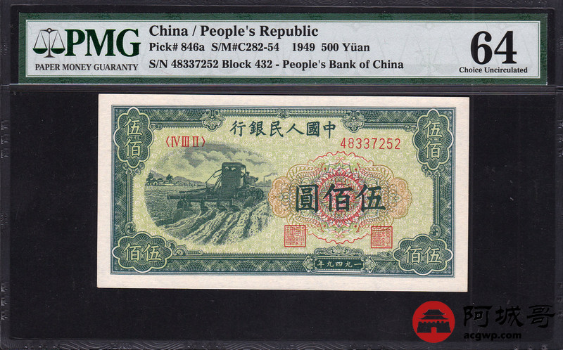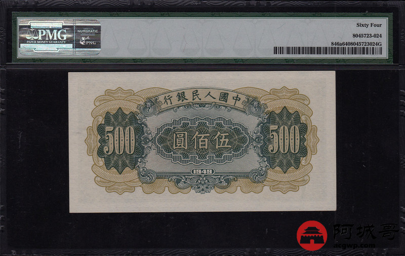 Lot:18 一版人民币 1949年 伍佰圆收割机 PMG 64