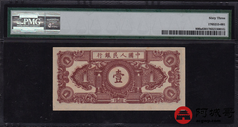 Lot:19 一版人民币 中华民国三十七年 壹圆工农 中国人民银行 PMG 63