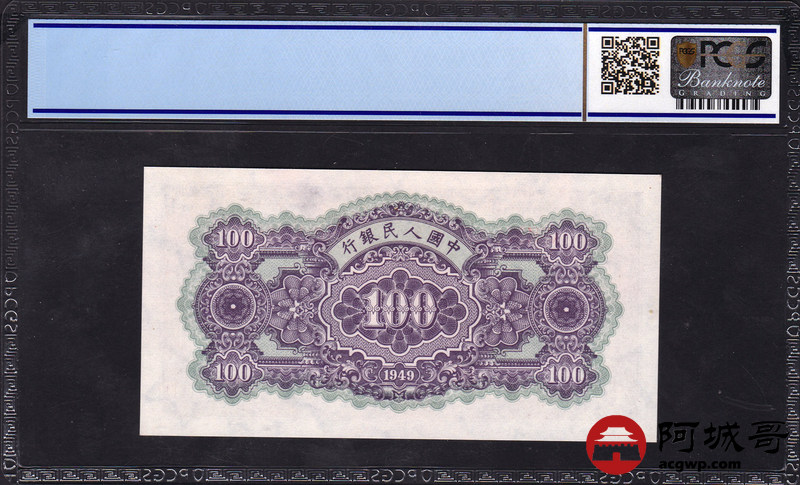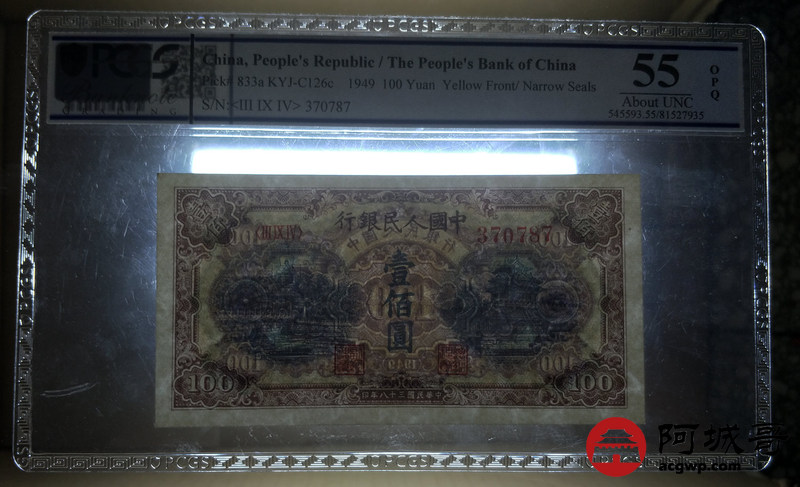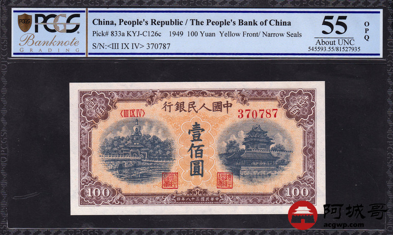 Lot:10 一版人民币 民国38年 壹佰圆黄北海 空心五角水印 印章窄距 好号无4 原票 色泽艳丽 PCGS 55 OPQ