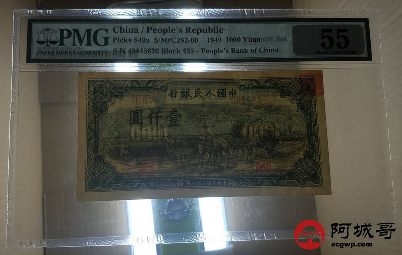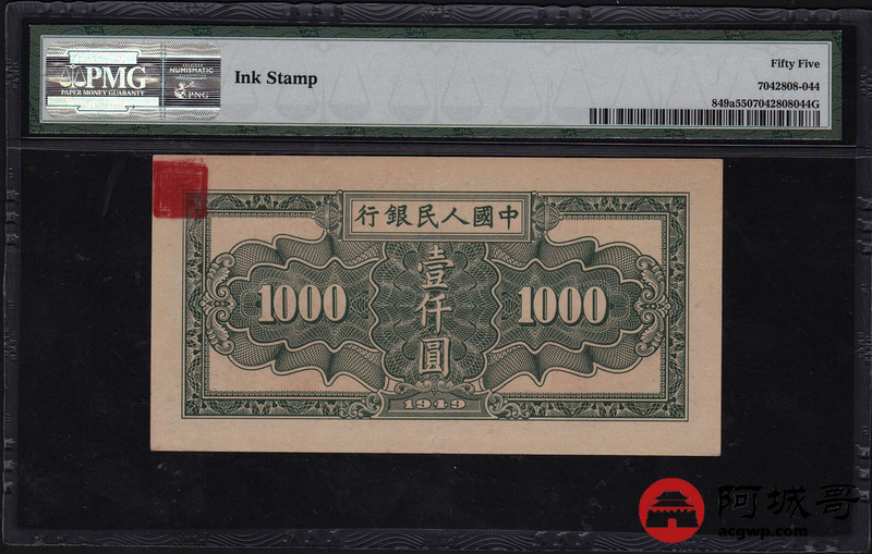 Lot:20 一版人民币 民国三十八年 壹仟圆秋收 中国人民银行 PMG 55