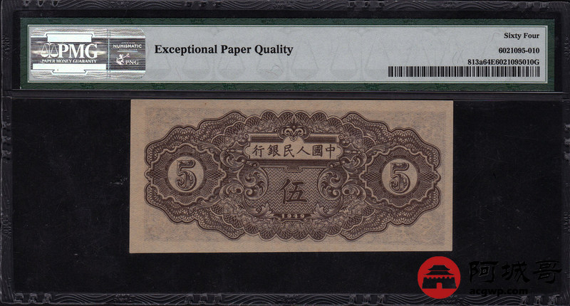 Lot:21 一版人民币 民國三十八年 伍圆织布 中国人民银行 PMG 64 EPQ 好号无4