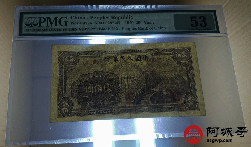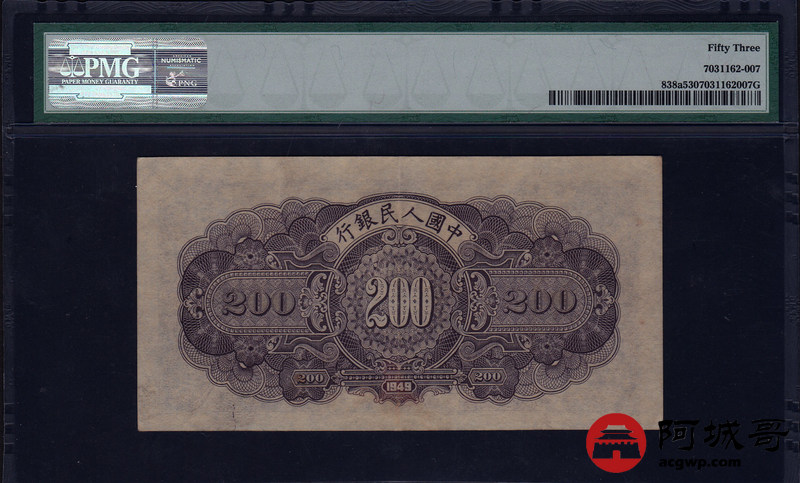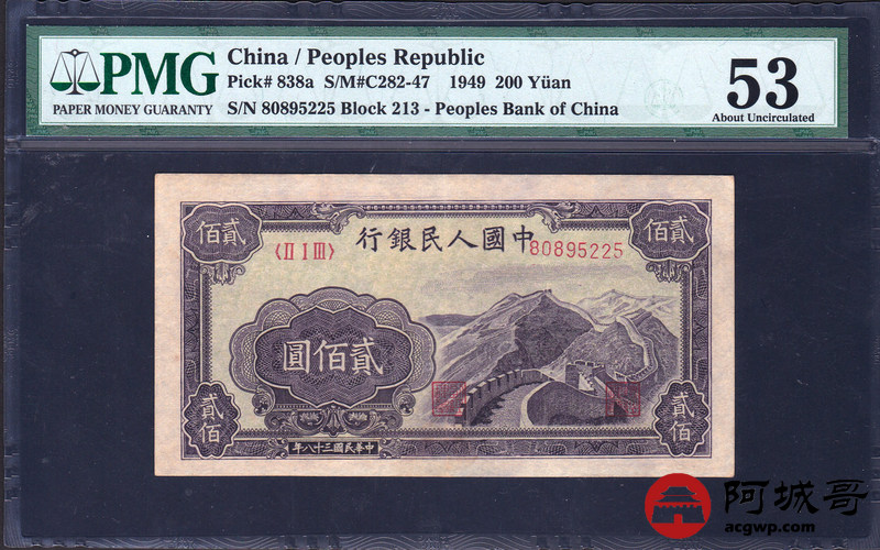 Lot:23 一版人民币 民国38年 贰佰圆长城 中国人民银行 PMG 53 号码不带47