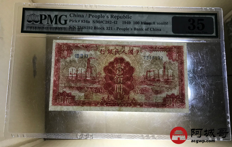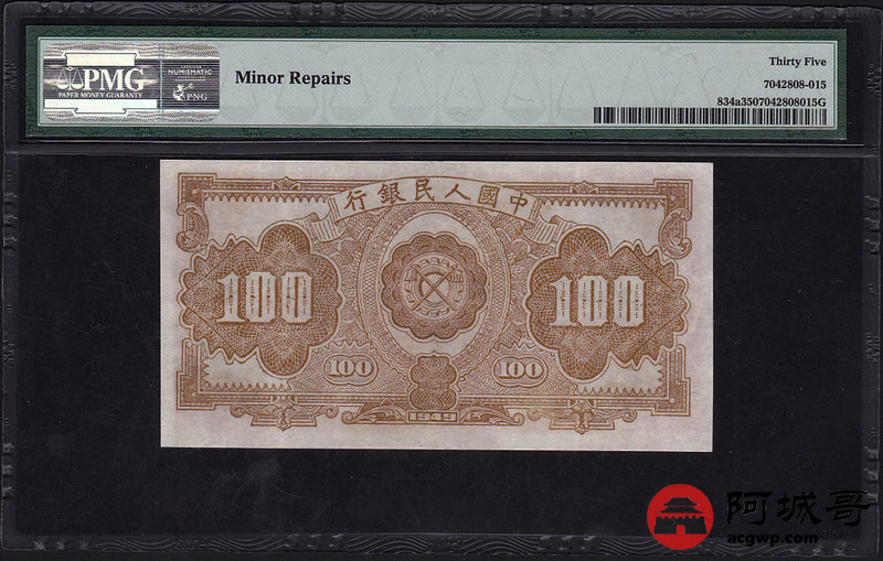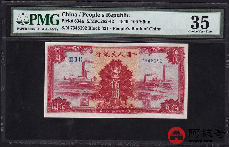 Lot:24 一版人民币 民国38年 壹佰圆红工厂 色泽艳丽 PMG 35