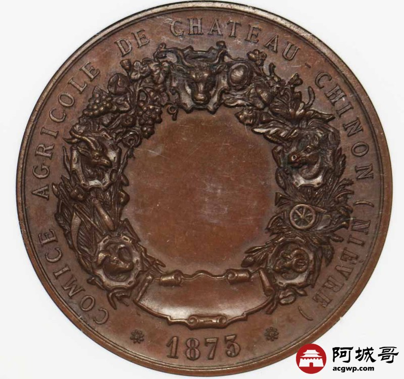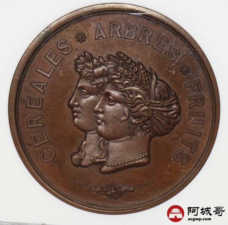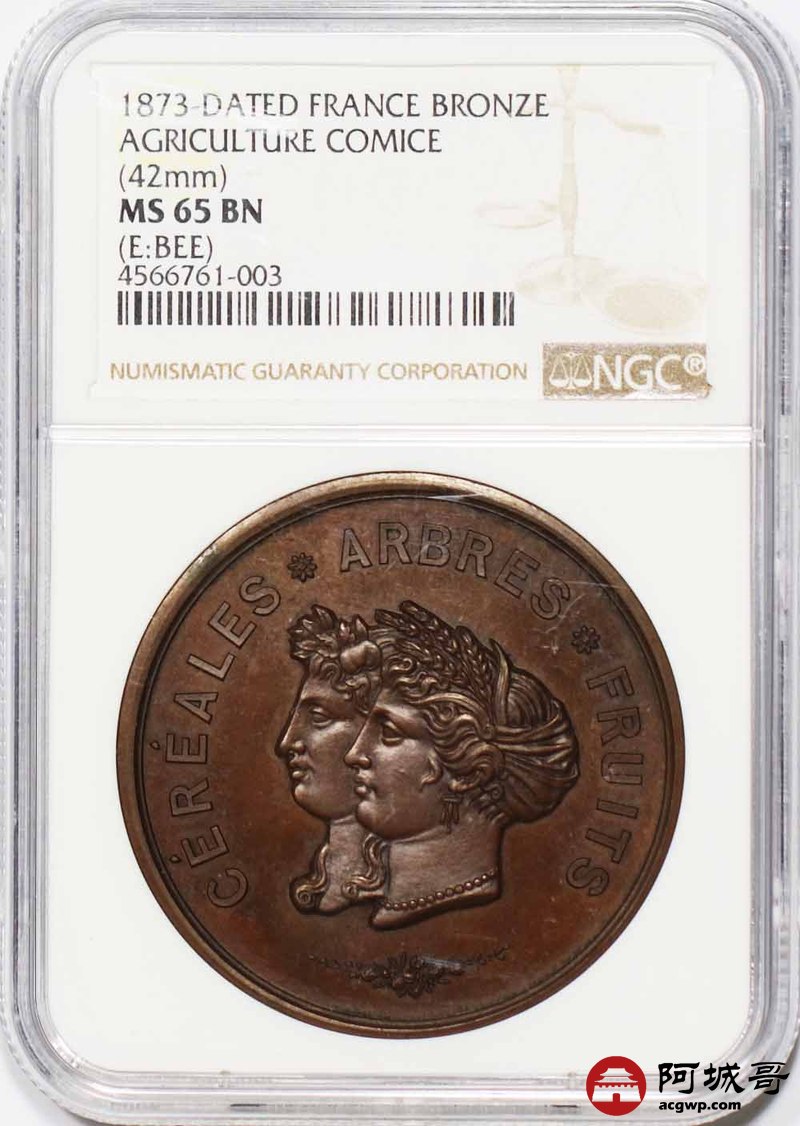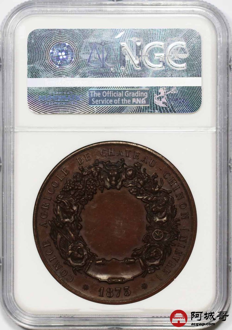 Lot:13 法国1873年 考密斯农业高浮雕铜章 NGC MS65BN