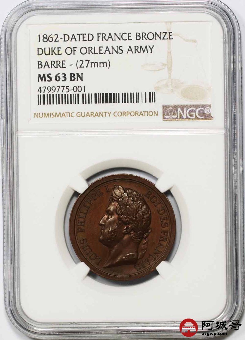 Lot:15 法国1862年奥尔良公爵 军队纪念铜章 NGC MS63BN