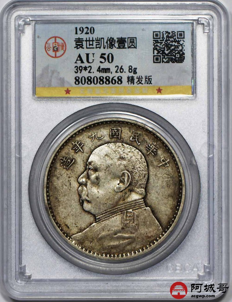 Lot:21 民国九年大头 精发版 原味 GBCA AU50