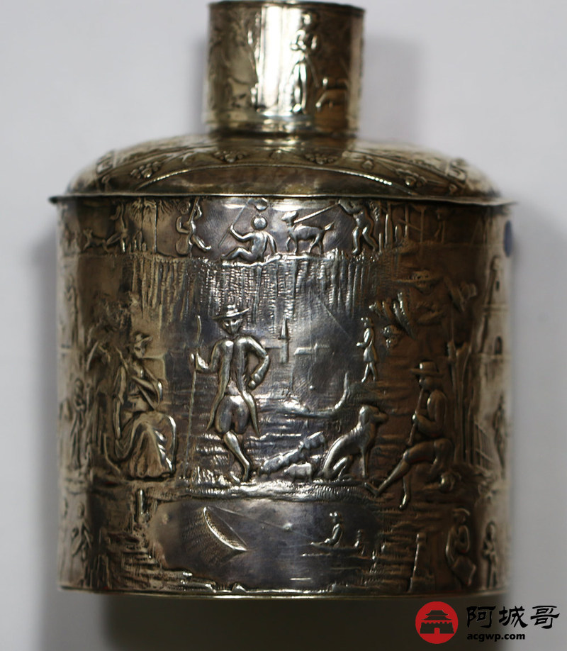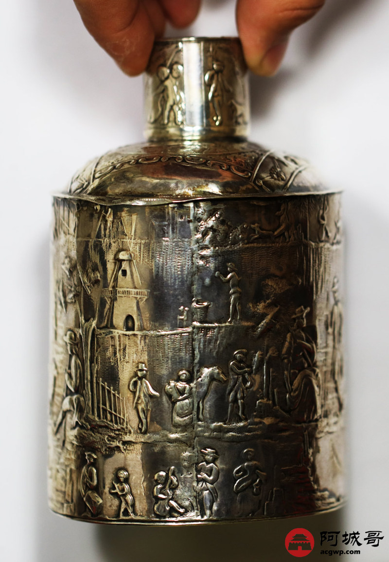 Lot:26 欧洲纯银故事人物图茶叶罐:重量:273克,尺寸:长10.5厘米,宽8厘米,高13厘米
