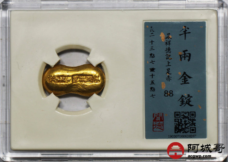 Lot:12 半两 金锭 凤祥德记上足赤 開德评级 88