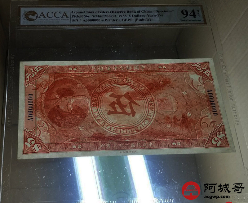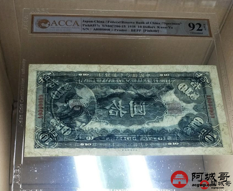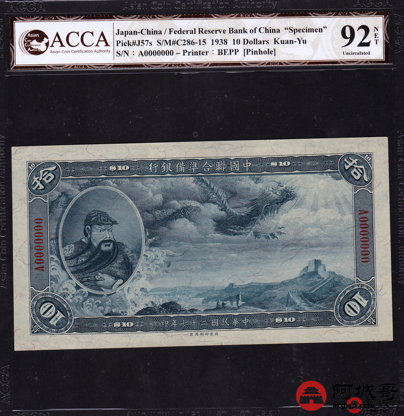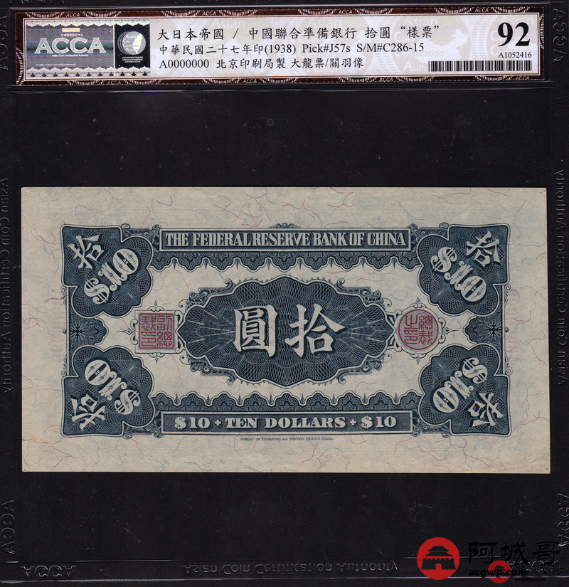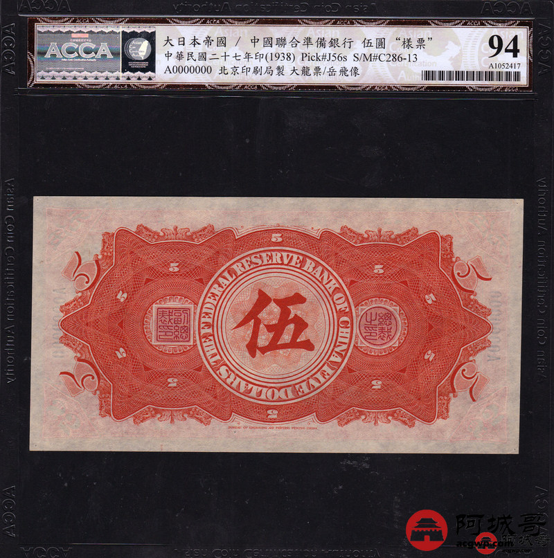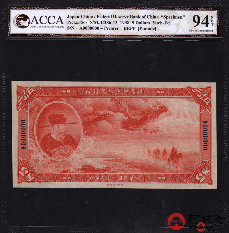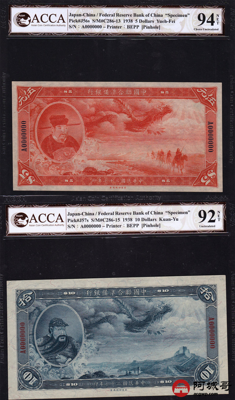 Lot:23 民国27年 中国联合准备银行 稀少大龙票票样两张 伍圆岳飞像、拾圆关公像两张 ACCA 94NET、92NET
