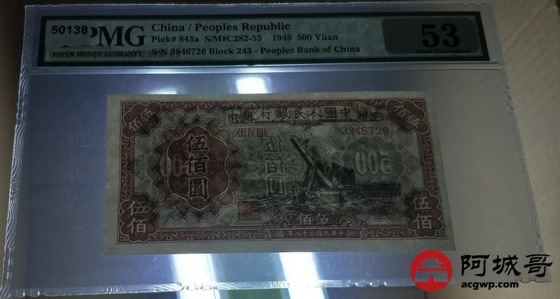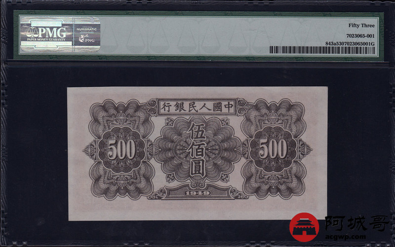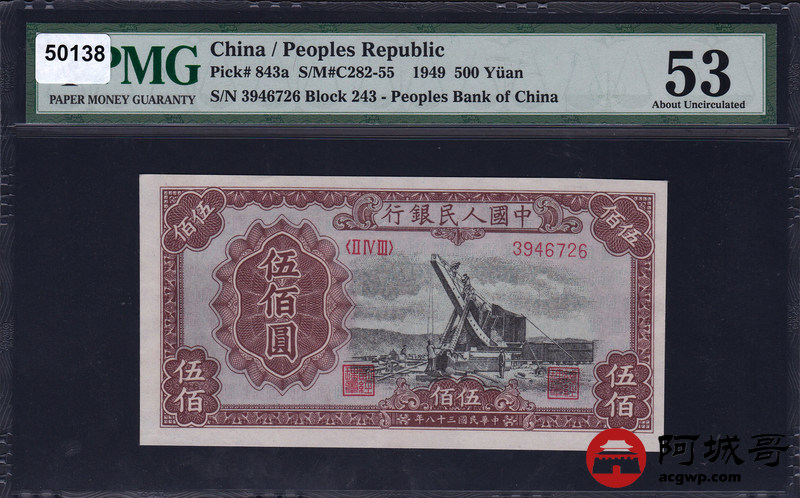 Lot:21 一版人民币 民国三十八年 伍佰圆起重机 中国人民银行 PMG 53