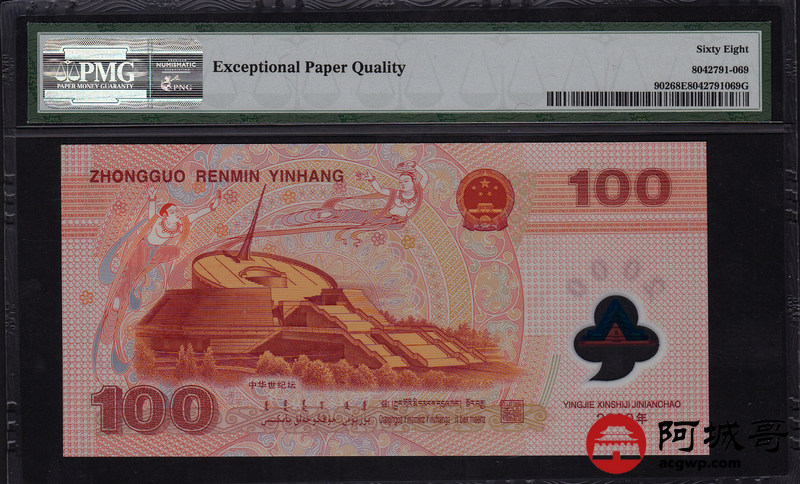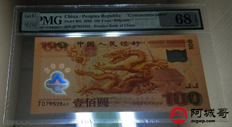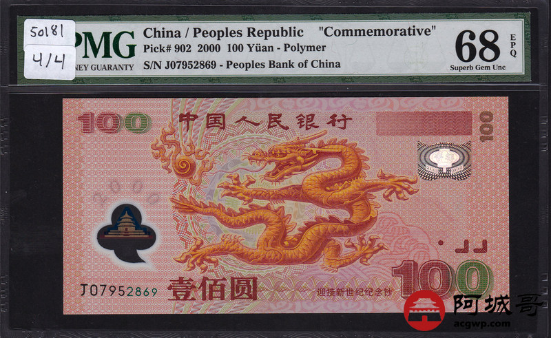 Lot:18 2000年 壹佰圆 千禧龙钞 季军分PMG 68 EPQ 好号无4