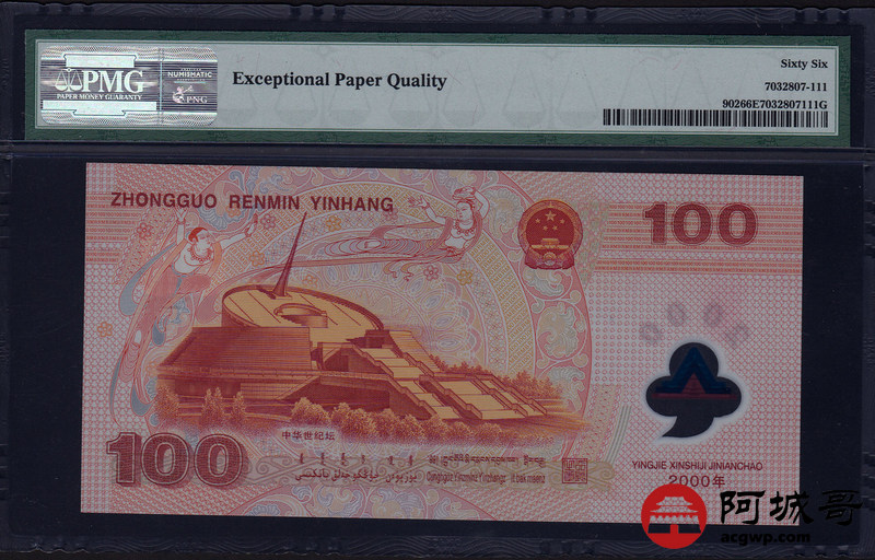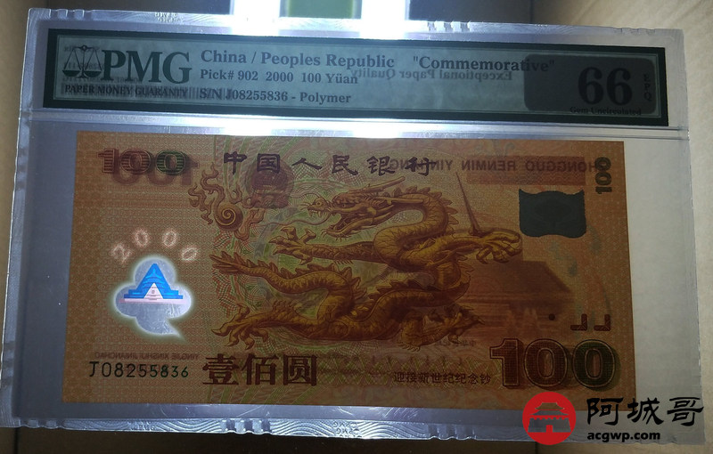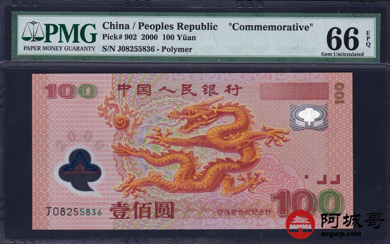 Lot:22 2000年 壹佰圆 千禧龙钞 PMG 66 EPQ 好号无47尾吉利号6