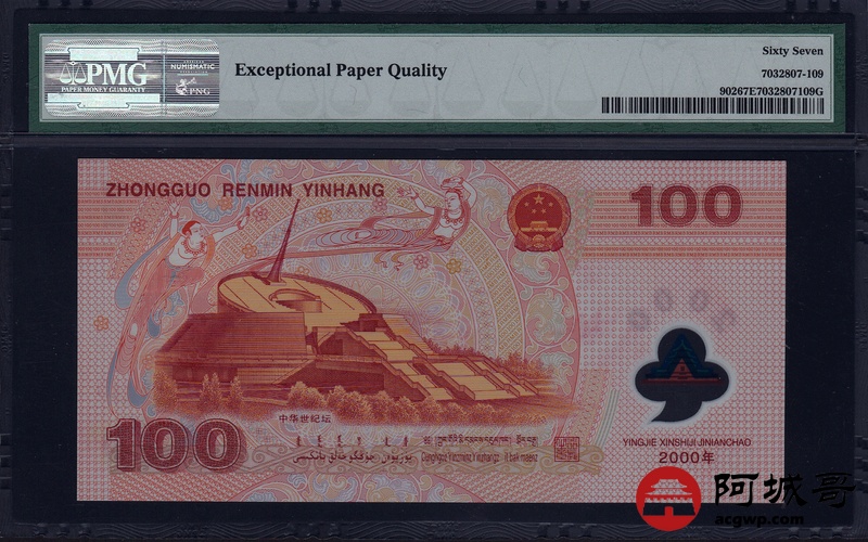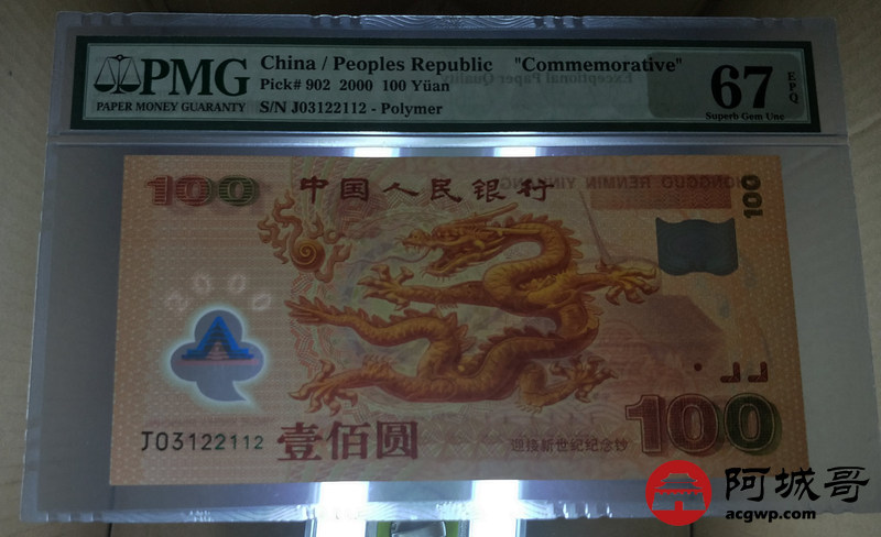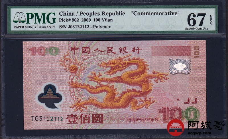 Lot:6 2000年 壹佰圆 千禧龙钞 PMG 67 EPQ 好号无47
