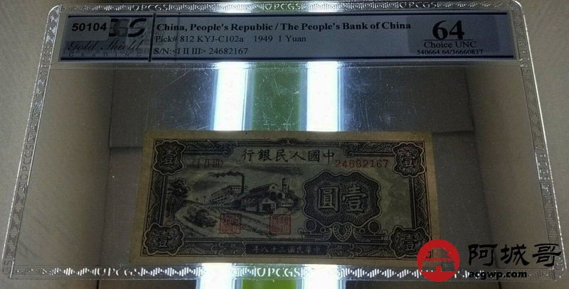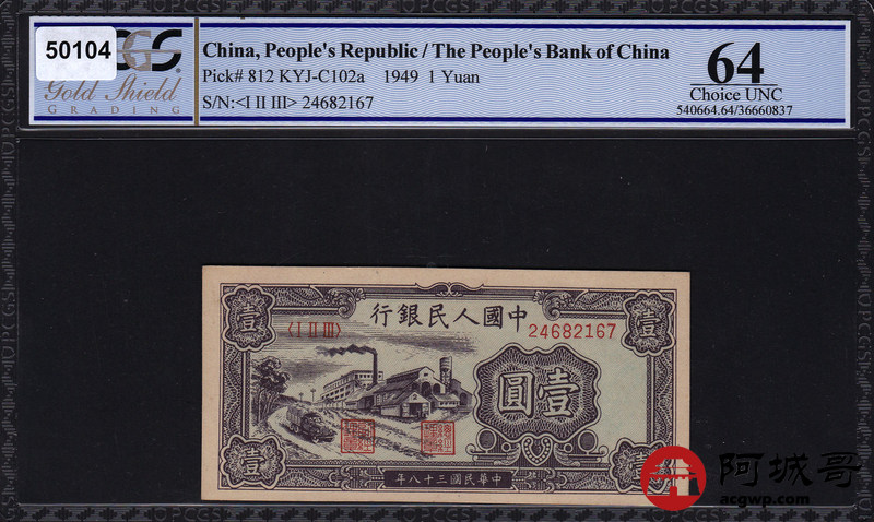 Lot:24 一版人民币 民国38年 壹圆工厂 PCGS 64
