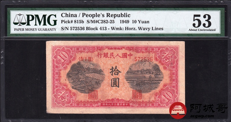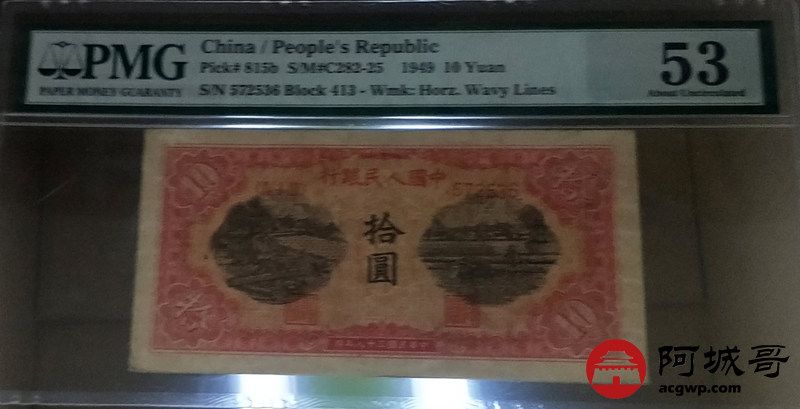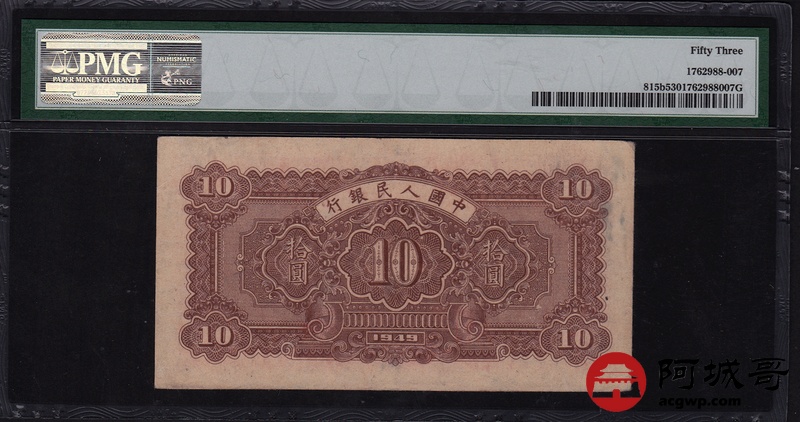 Lot:12 一版人民币 民国三十八年 拾圆锯木 中国人民银行 横波纹水印 PMG 53