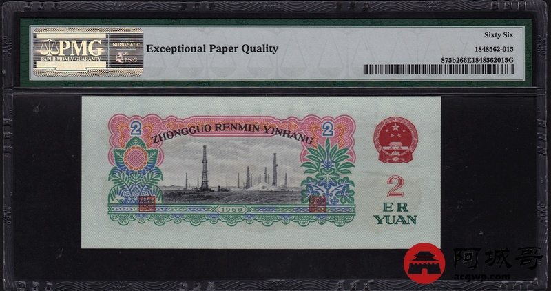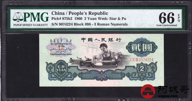 Lot:12 三版人民币 1960年 贰圆车工 古币水印 中国人民银行 PMG 66 EPQ