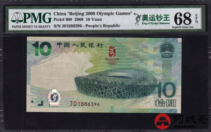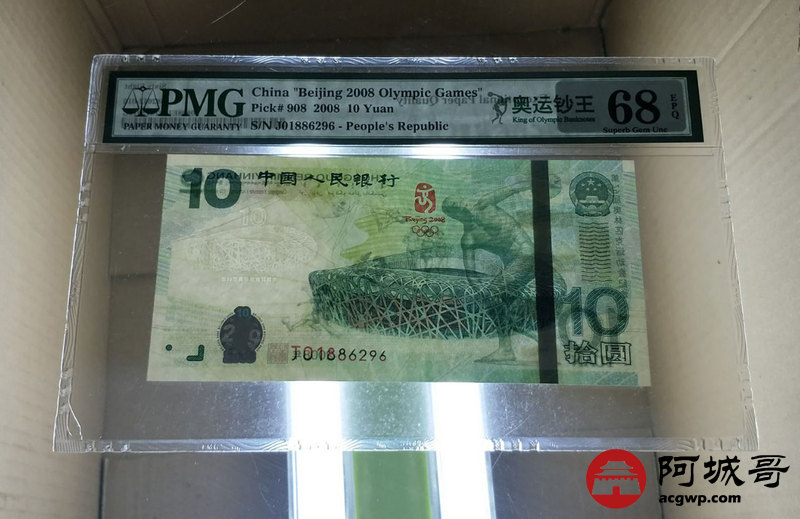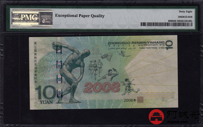 Lot:14 2008年 奥运钞拾圆 高分PMG 68 EPQ 好号无347尾号6