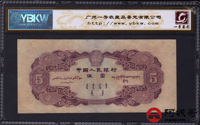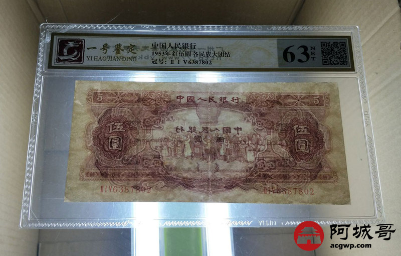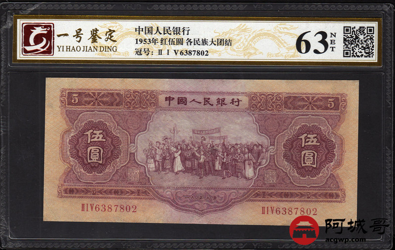 Lot:11 二版人民币 一九五三年 红伍圆 好号无4一号鉴定 63 NET 有修