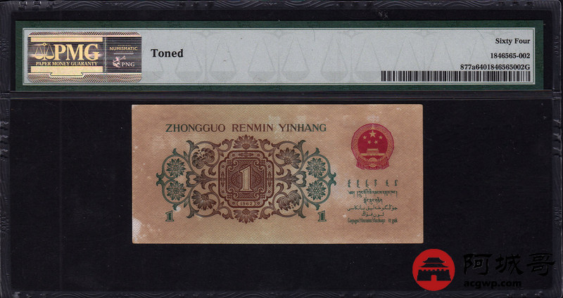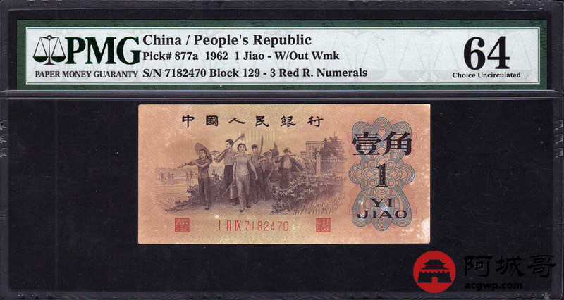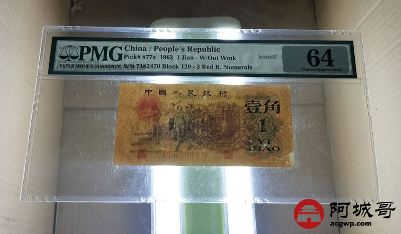 Lot:19 三版人民币 1962年 背绿壹角 三版小珍品 中国人民银行 PMG 64
