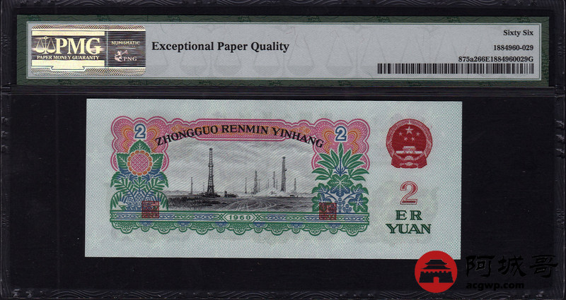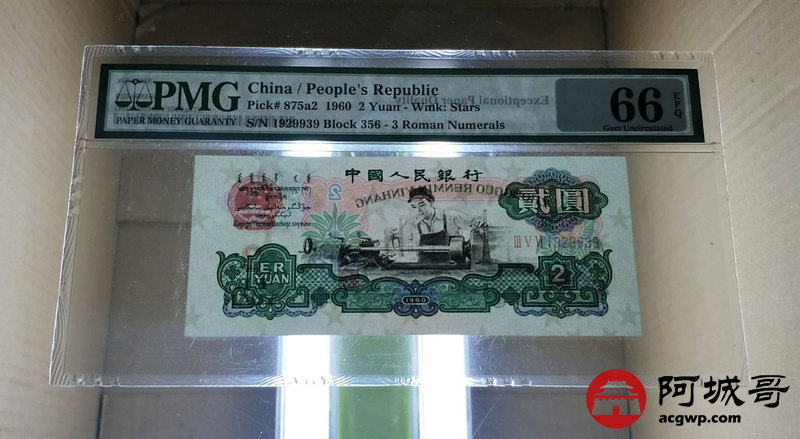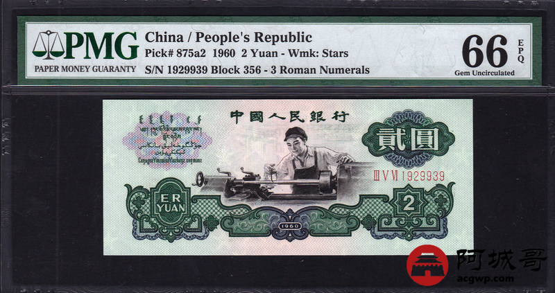 Lot:16 三版人民币 1960年 贰圆车工 五星水印 好号无47 中国人民银行 PMG 66 EPQ