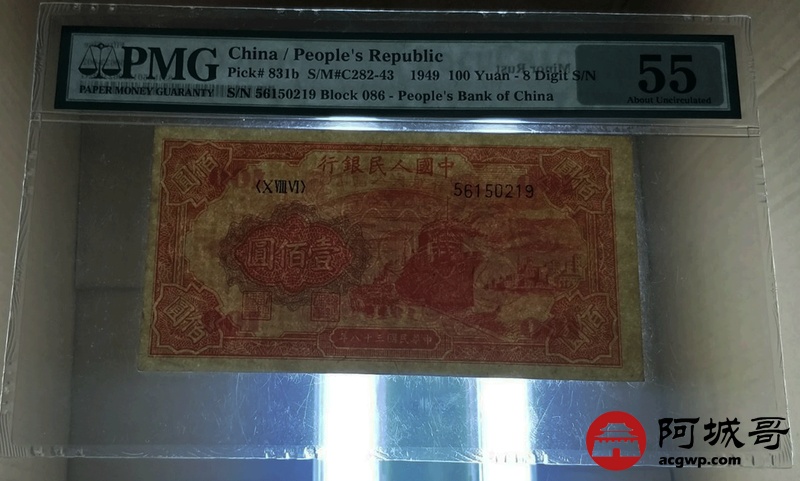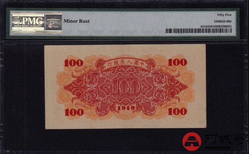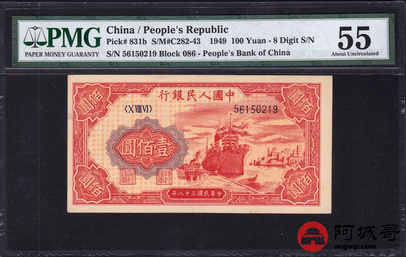 Lot:17 一版人民币 民国38年 壹佰圆红轮船 中国人民银行 PMG 55 好号无47