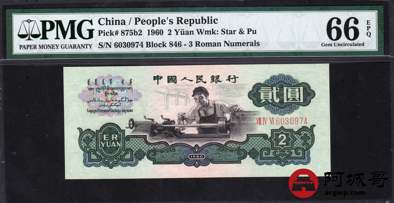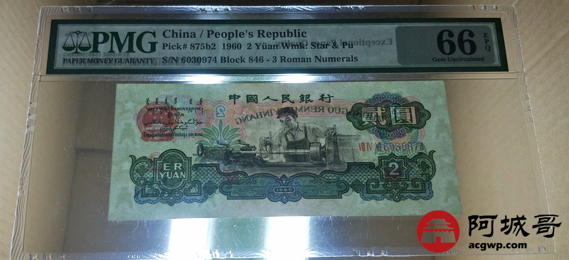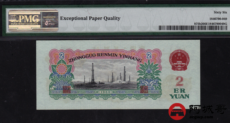 Lot:10 三版人民币 1960年 贰圆车工 中国人民银行 PMG 66 EPQ 古币水印