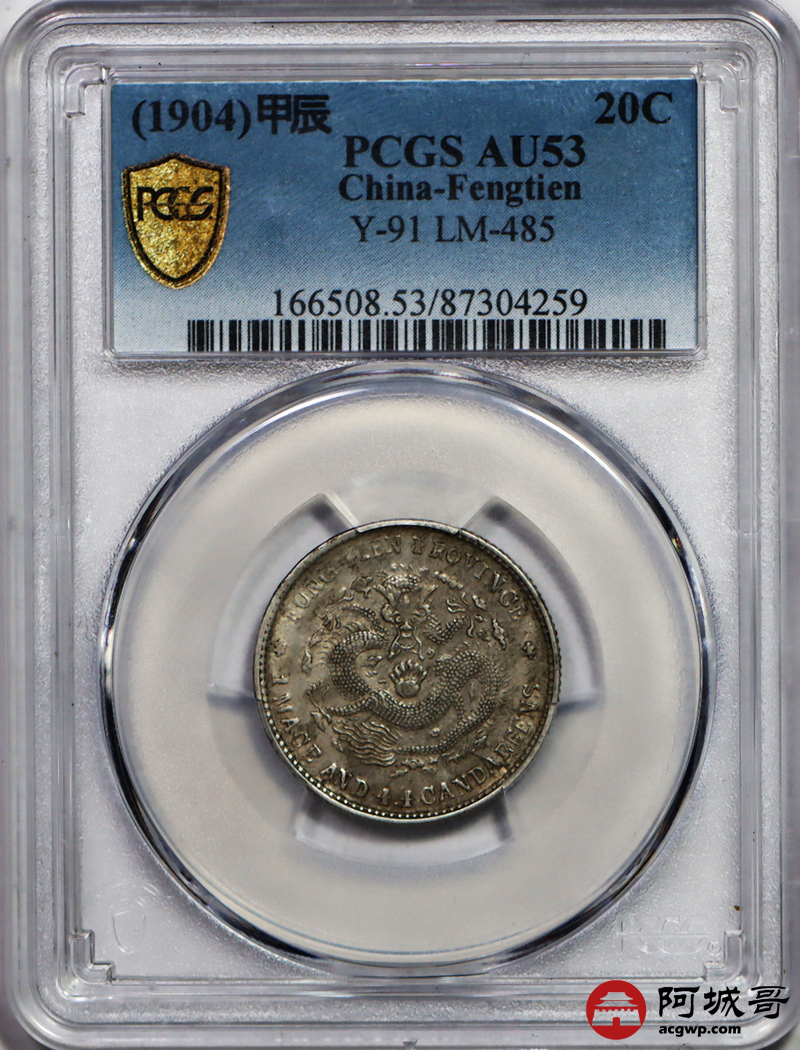Lot:59 原味 底光 奉天光绪 甲辰龙洋 两角 PCGS AU 53