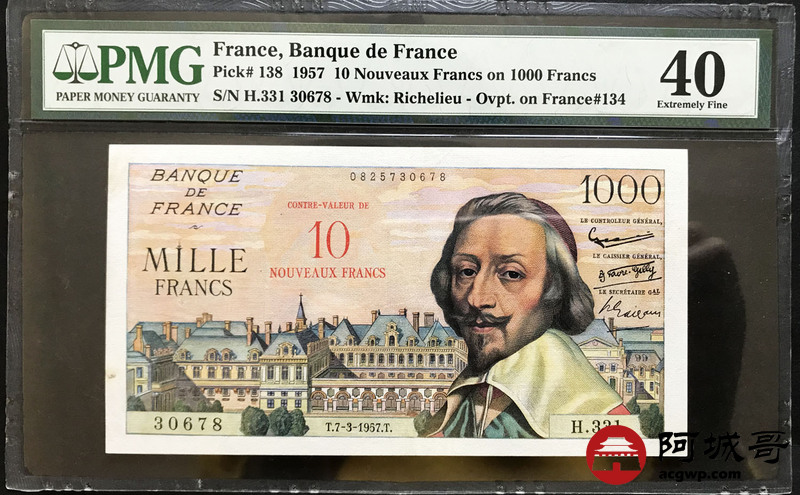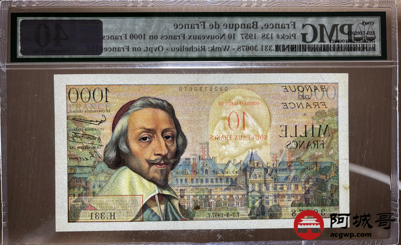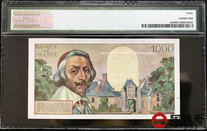 Lot:30 法国 法兰西银行 1957年 1000法郎 PMG 40 较少见