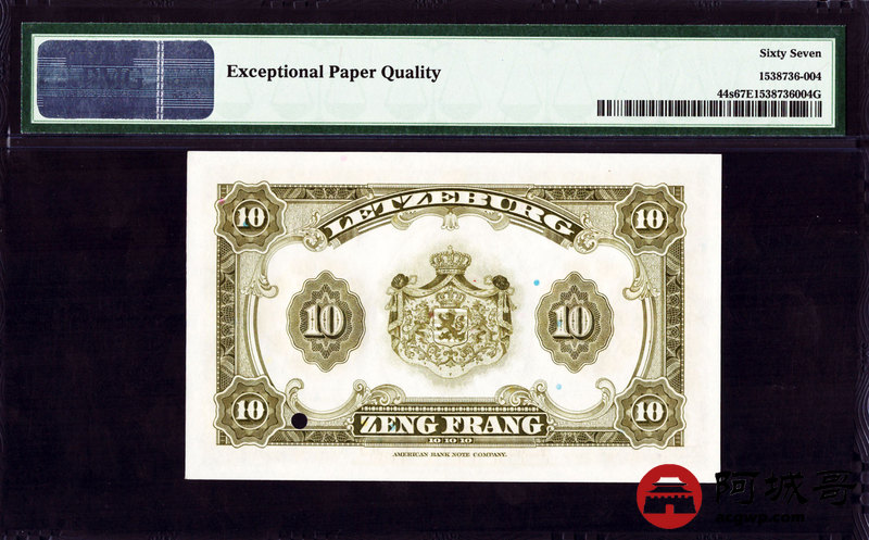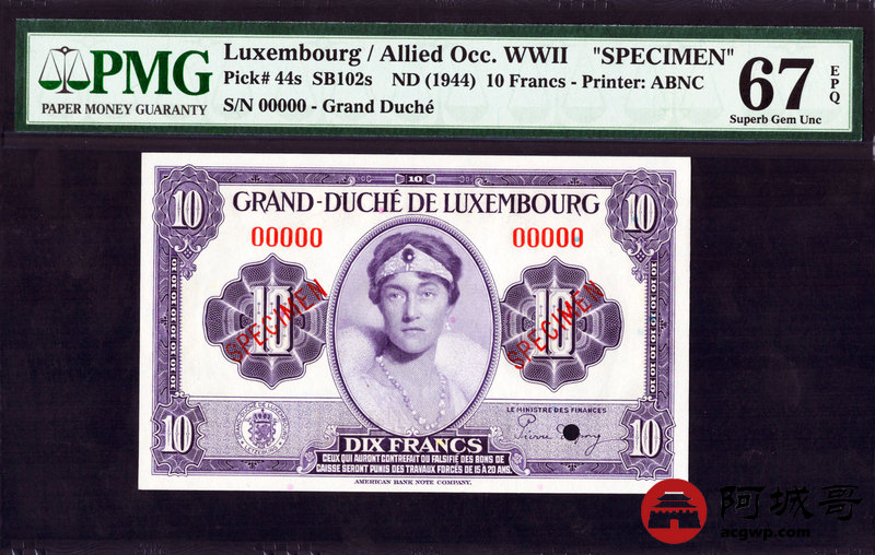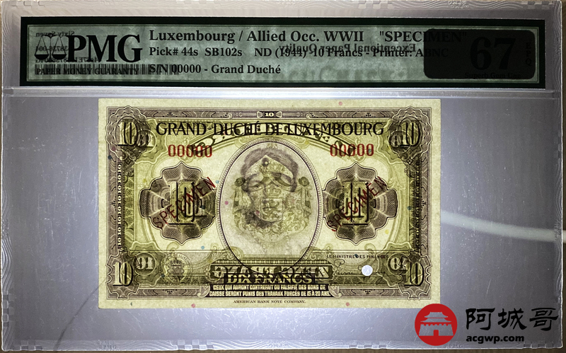 Lot:5 1944年 卢森堡 10法郎 PMG 67EPQ 票样 仅此一张67EPQ