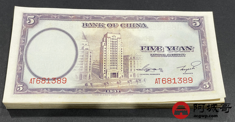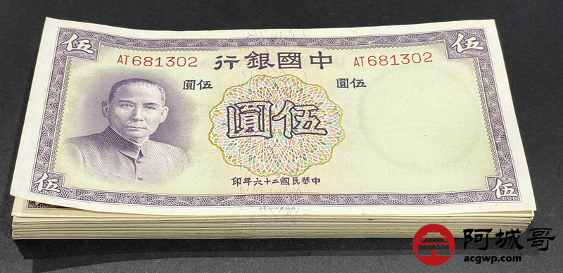Lot:3 民国26年 中国银行伍圆 02-89 共88张 连号 85成新以上