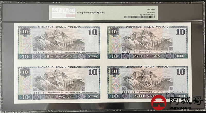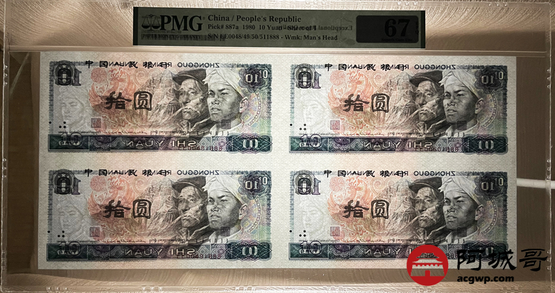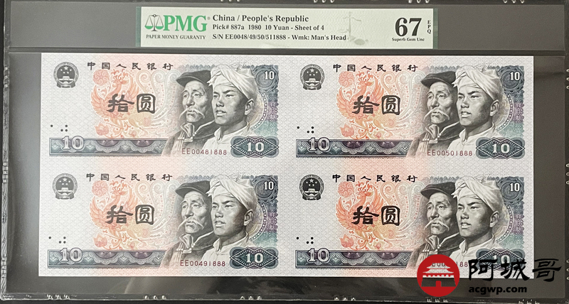 Lot:4 四版 1980年 拾圆 四连体 尾号888 PMG 67EPQ 好号无47尾号888