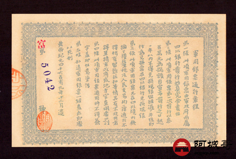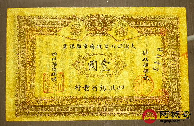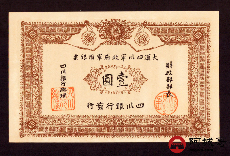 Lot:28 大漠四川军政府军用银票 壹圆 97至全新