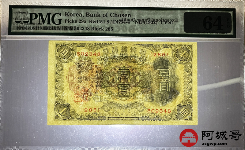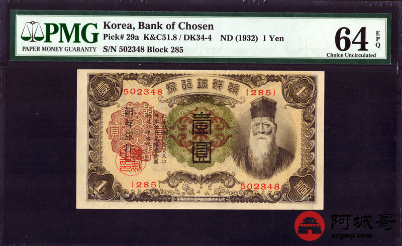 Lot:11 1932年 朝鲜银行壹圆 PMG 64EPQ