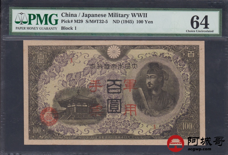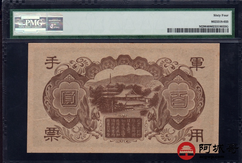 Lot:2 二战时期日本军用手票 百元 PMG 64