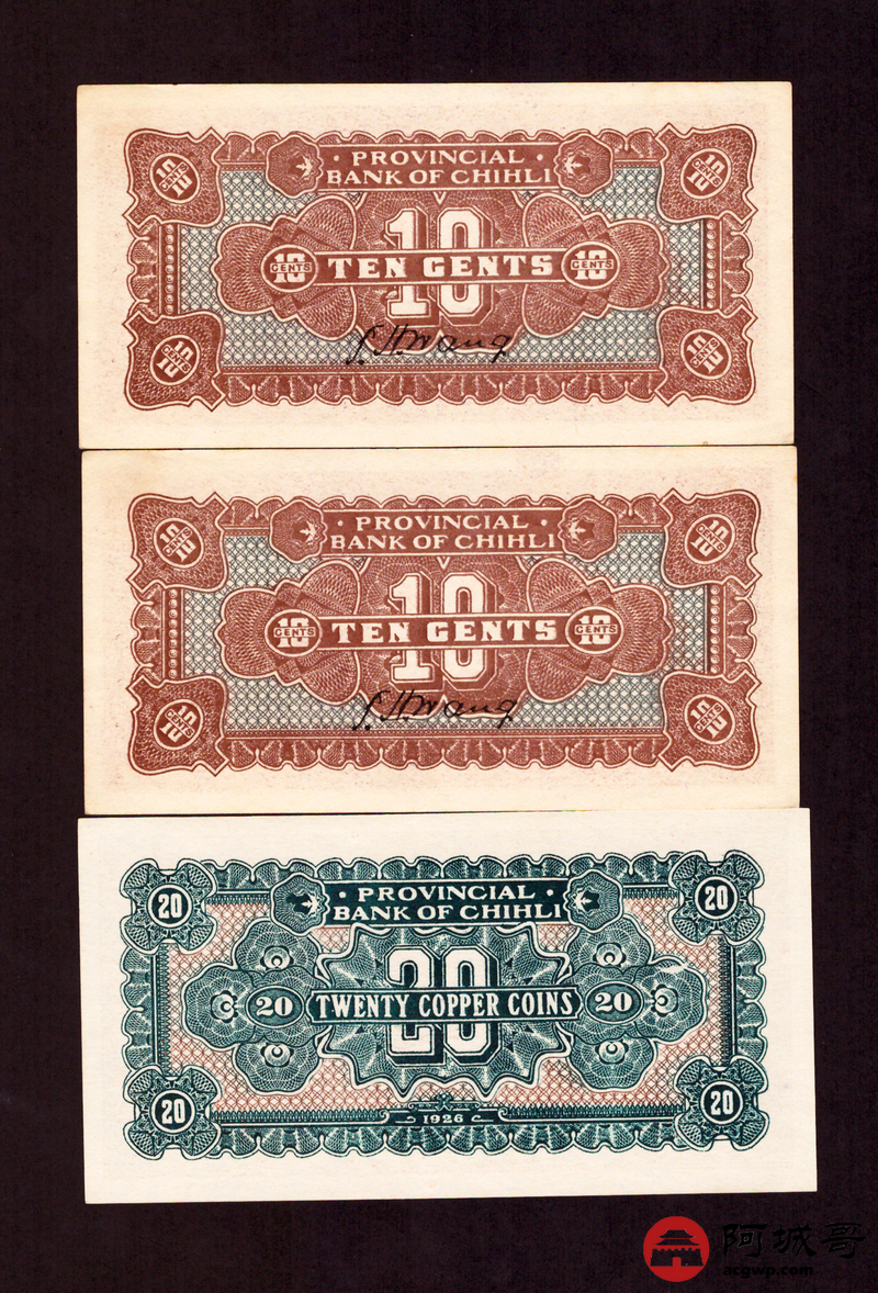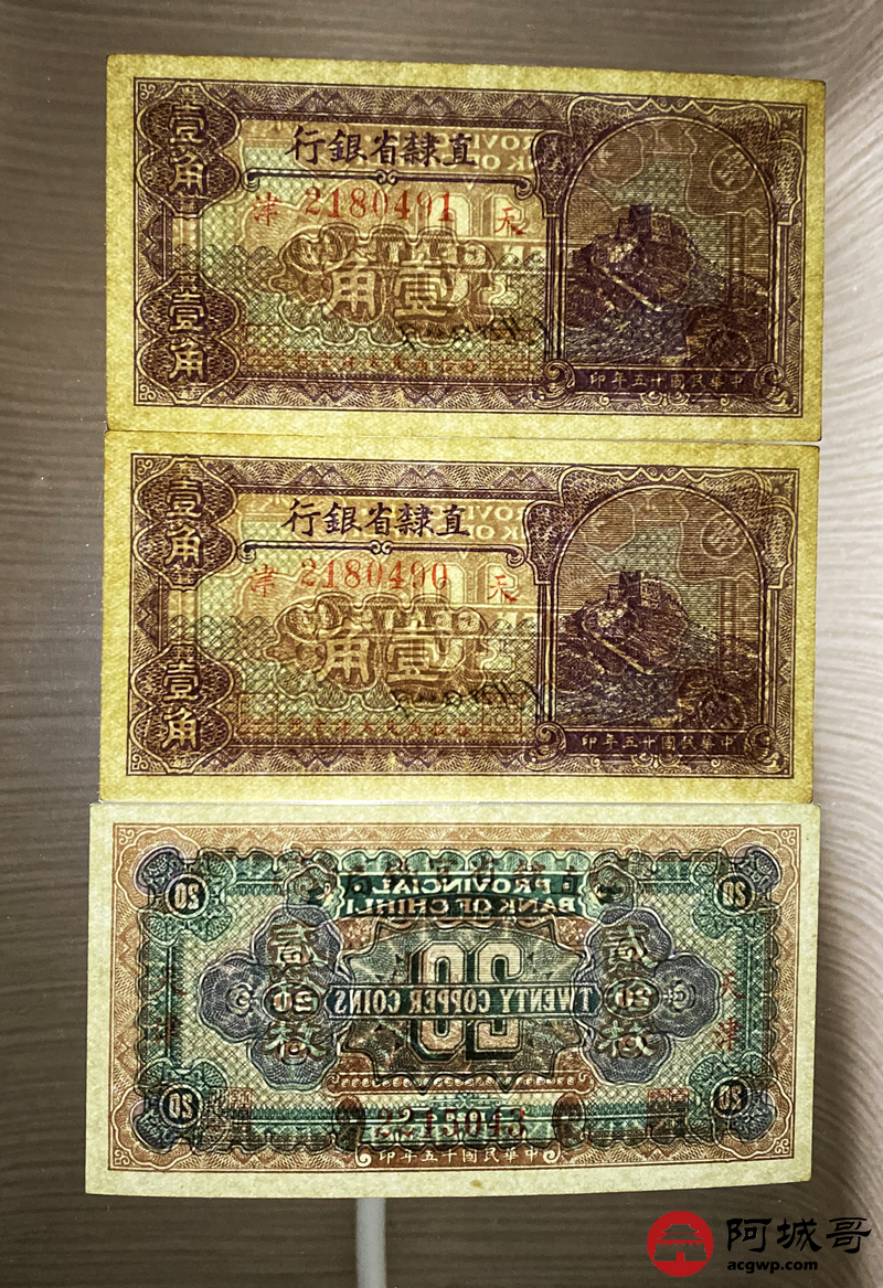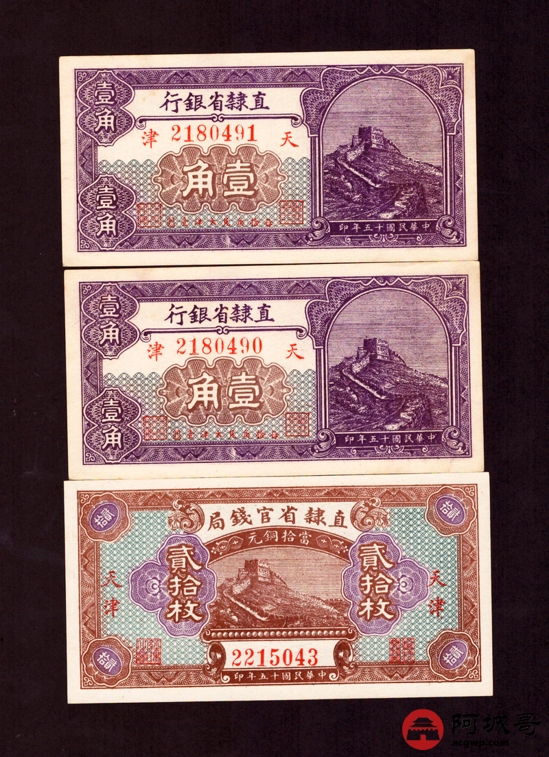 Lot:25 直隶省银行 壹角 ;民国15年 直隶省官钱局 贰拾枚 天津地名 9至94成新