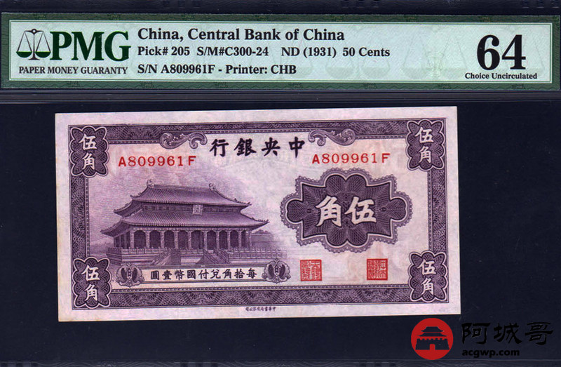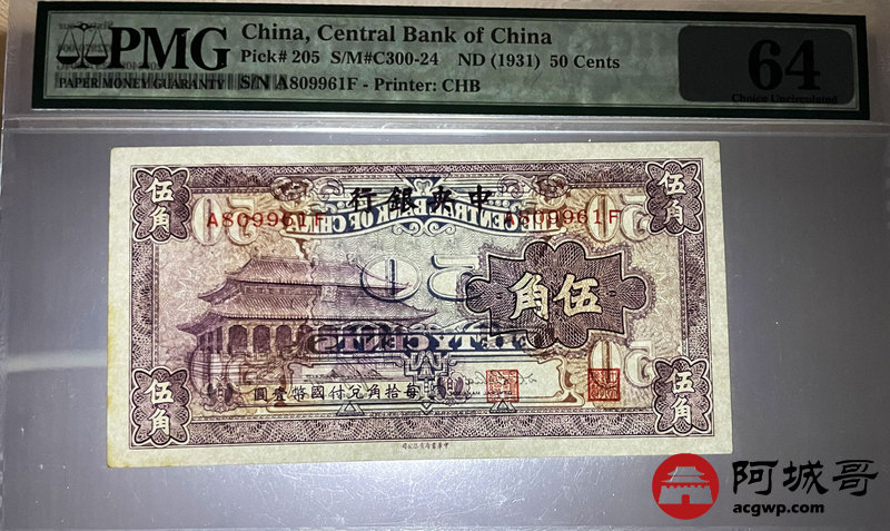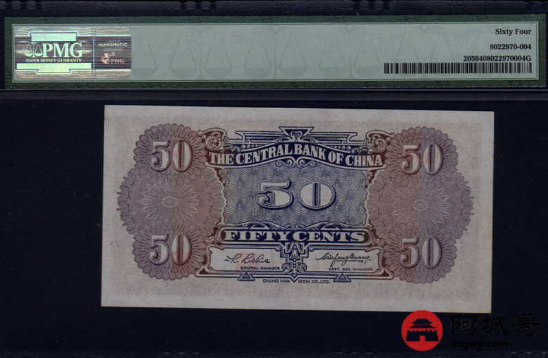 Lot:29 中央银行 长号伍角 紫色版 中华书局版 PMG 64 少见