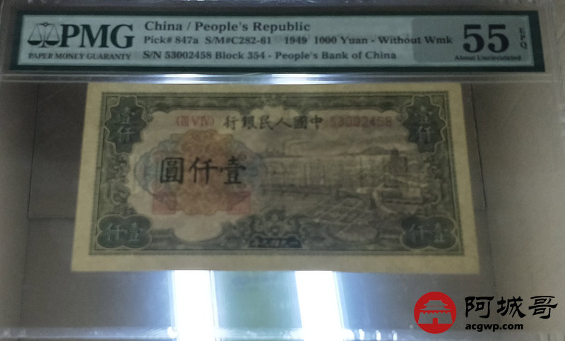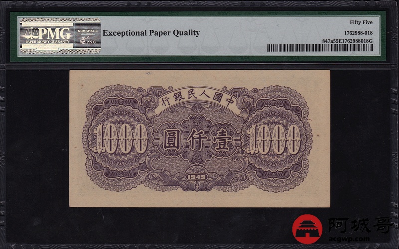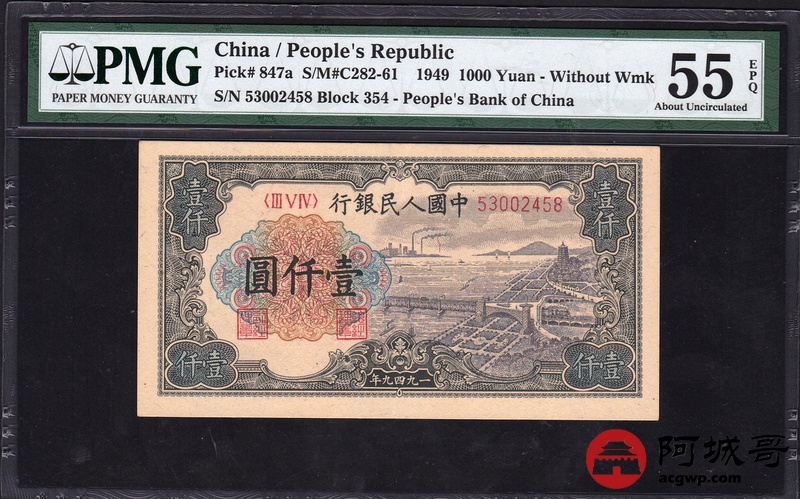 Lot:9 一版 1949年 壹仟圆钱塘江桥 PMG 55 EPQ