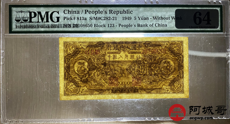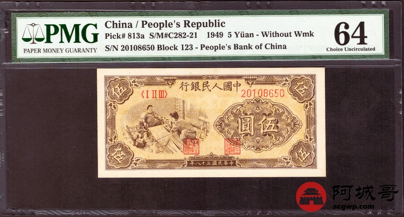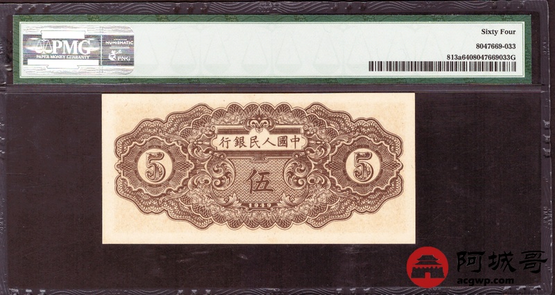 Lot:13 一版 民国38年 伍圆织布 PMG 64