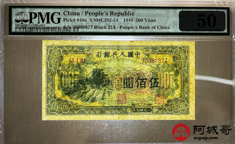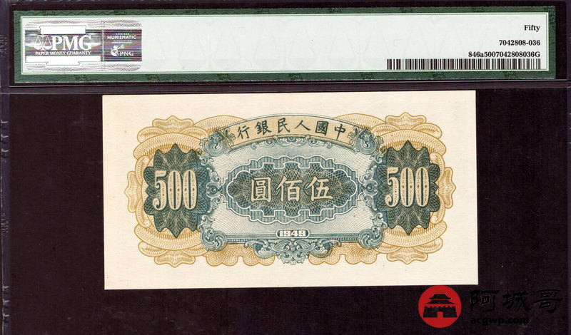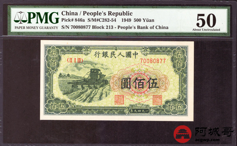 Lot:11 一版 1949年 伍佰圆收割机 好号无4 PMG 50