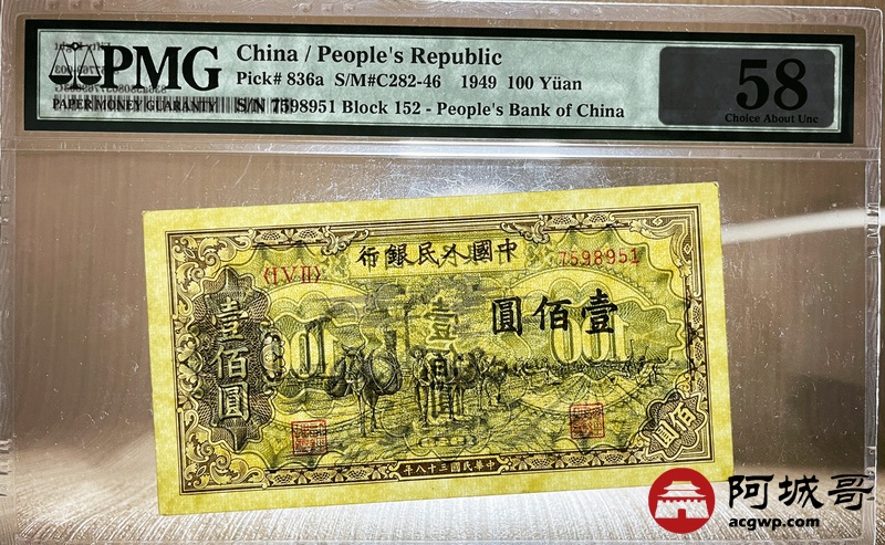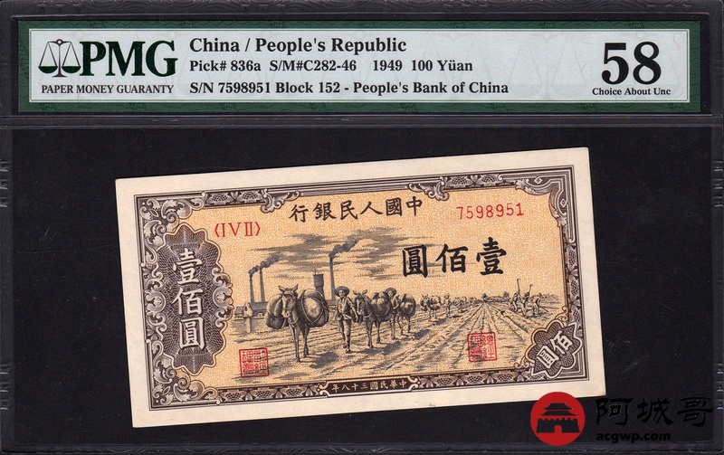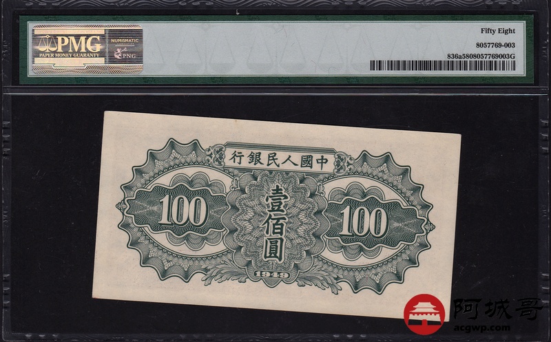 Lot:10 A 一版 民国38年 壹佰圆驮运 中国人民银行 PMG 58