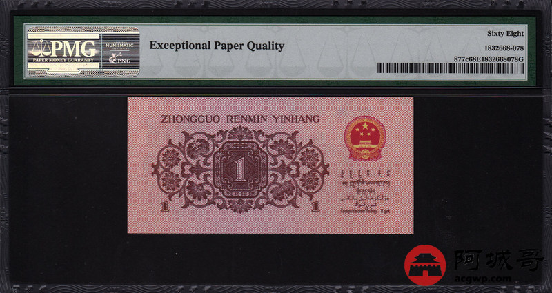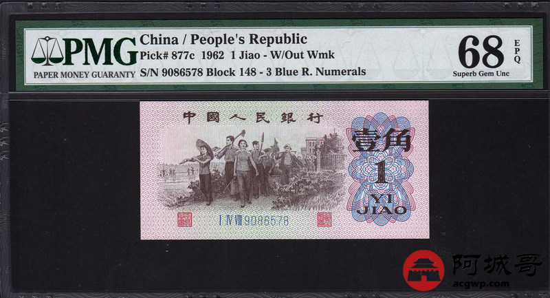 Lot:1 三版 1962年 壹角 蓝3冠 平版 好号全程无4 高分 PMG 68EPQ