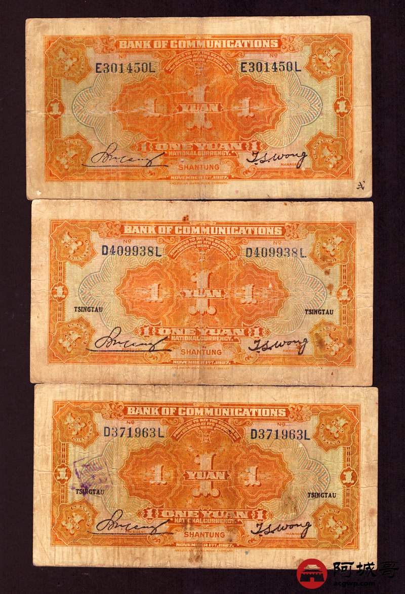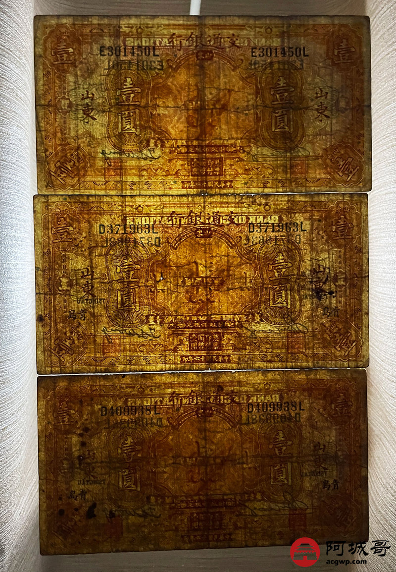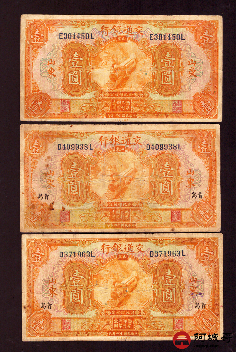 Lot:20 民国16年 交通银行 壹圆 三枚一组 山东、青岛地名 8至85成新