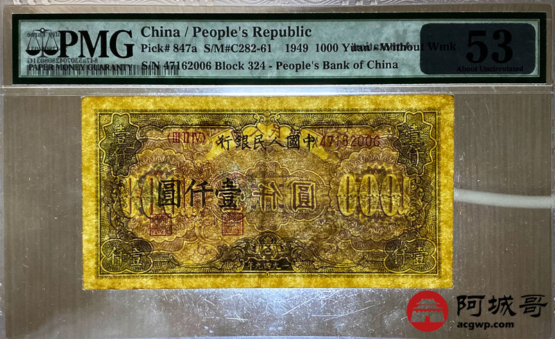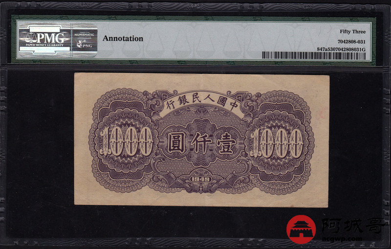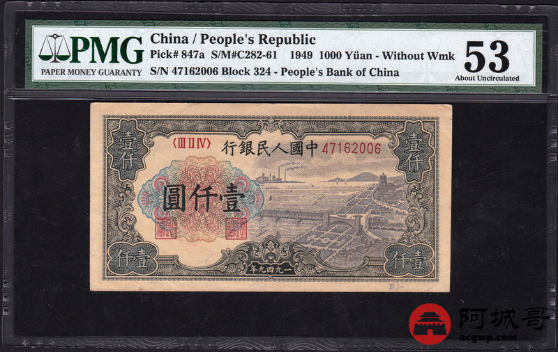 Lot:12 一版 1949年 壹仟圆钱塘江大桥 无水印 PMG 53