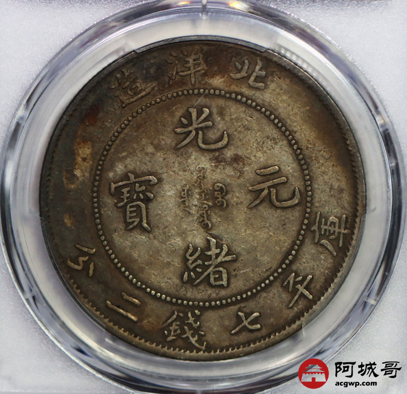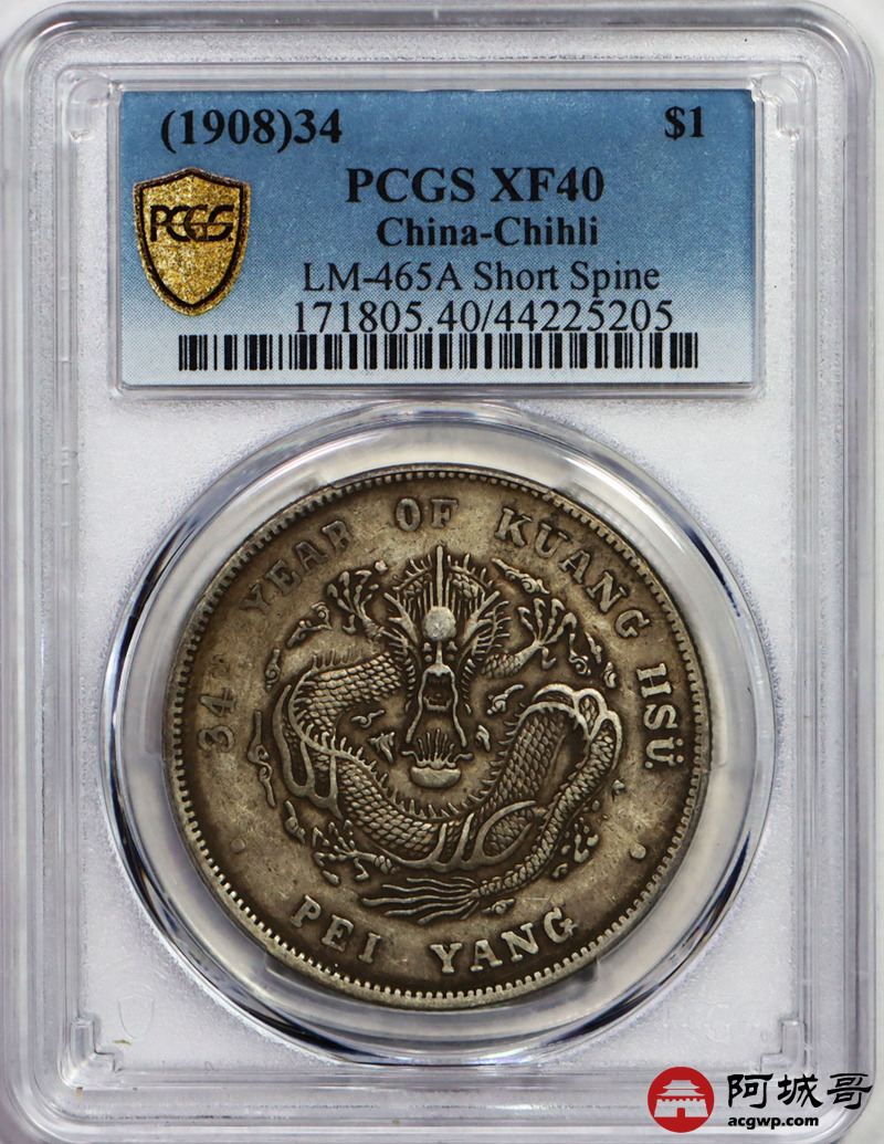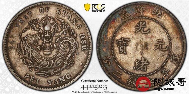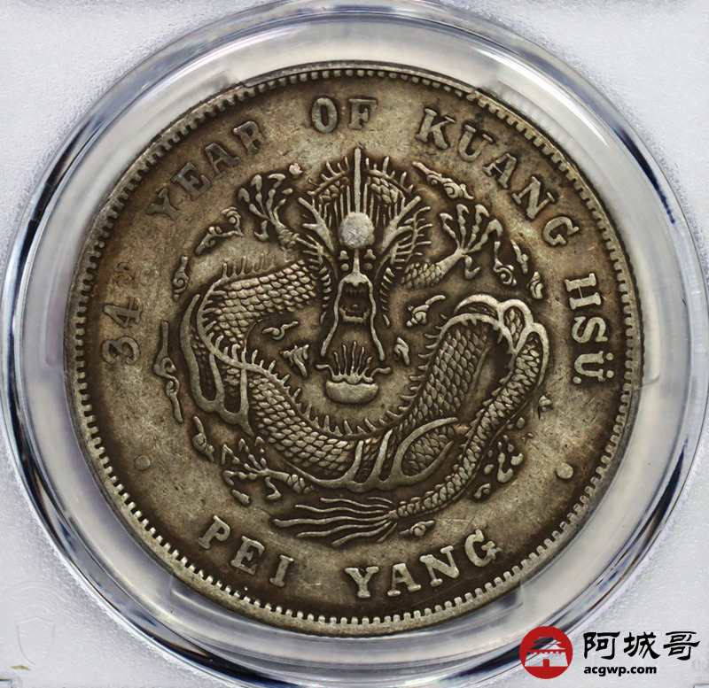 Lot:7 原味月牙彩北洋34七钱二分短尾龙 PCGS XF40