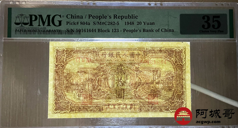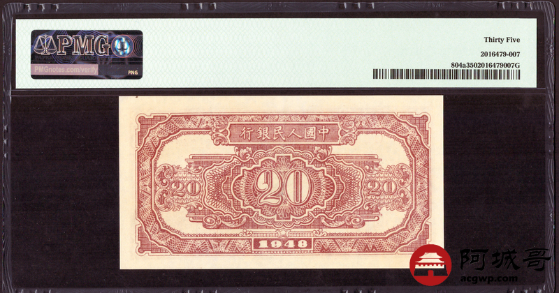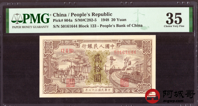 Lot:11 一版 民国37年 贰拾圆驴子与矿车 PMG 35 稀少