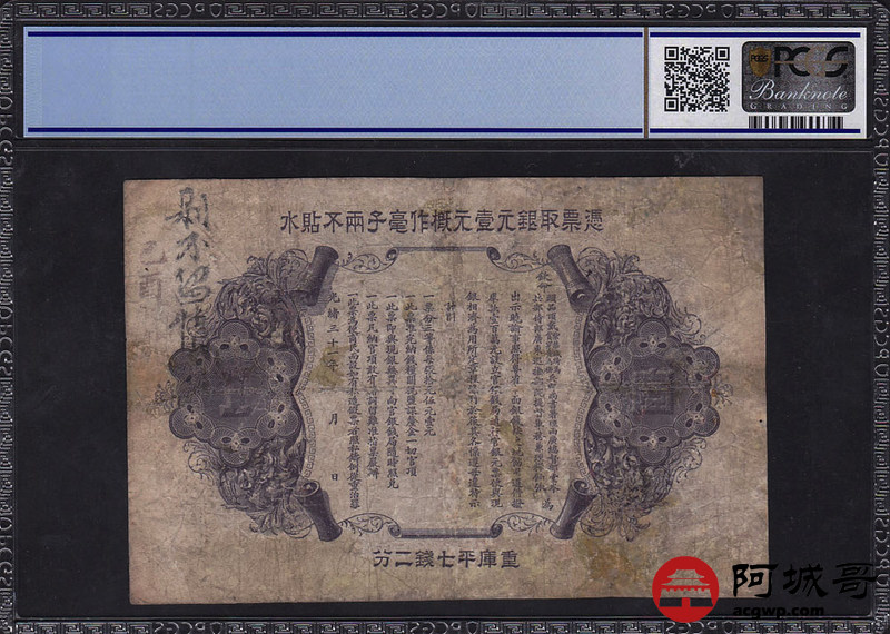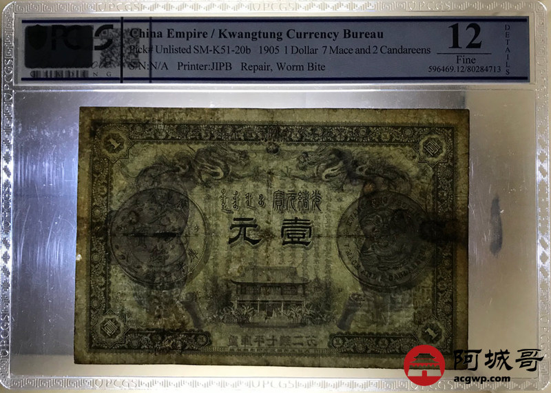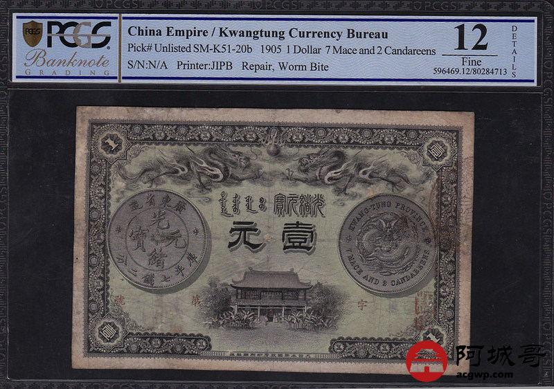 Lot:18 光绪三十一年(1905年)广东钱局壹元 少见 PCGS 12 微修