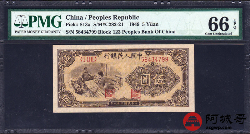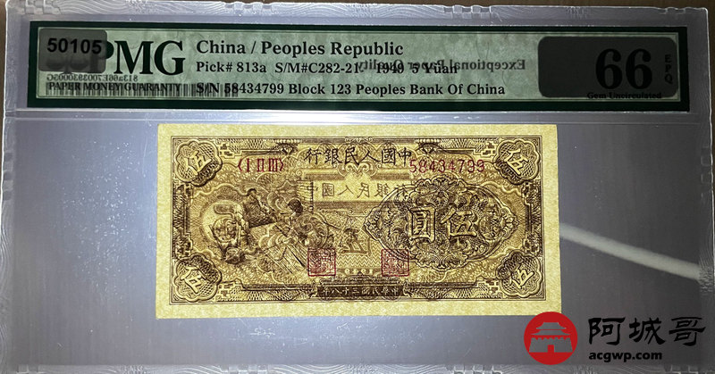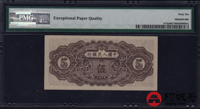 Lot:7 一版 民国38年 伍圆织布 高分PMG 66EPQ