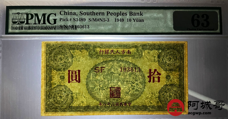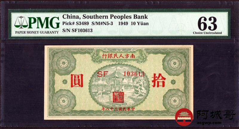 Lot:29 1949年 南方人民银行拾圆 PMG 63